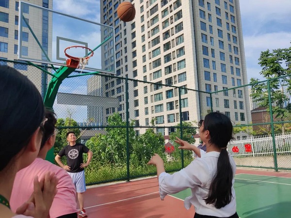 選手們手捧籃球,目盯籃筐,屏息吸氣,全力投籃,雖然不能百投百中,但大家都相互喝彩、鼓勵。